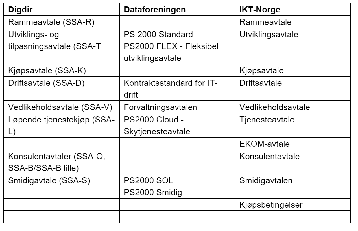 Digdir er en offentlig aktør som står for utformingen av statens standardavtaler (SSA). Deres standardavtaler er hovedsakelig utformet for det offentlige, men er også i stor grad benyttet av private. Kontraktene er utformet etter innspill fra leverandør- og kundesiden.